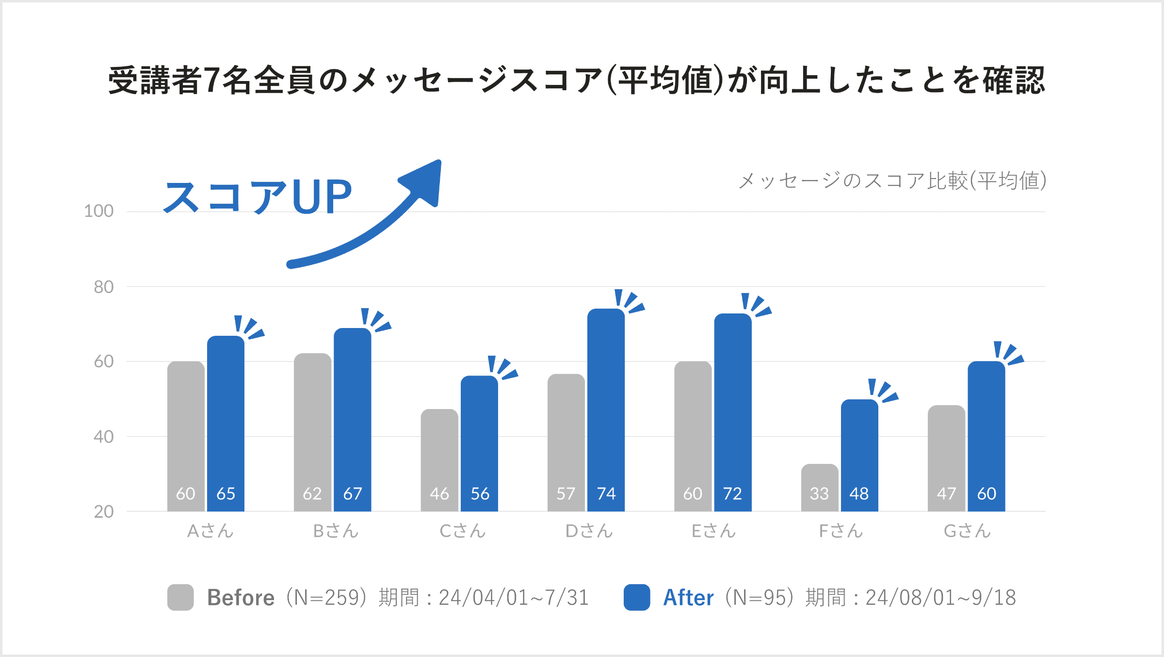 効果検証結果①:メッセージの質を評価するスコア(メッセージスコア)に関する学習前後の比較結果