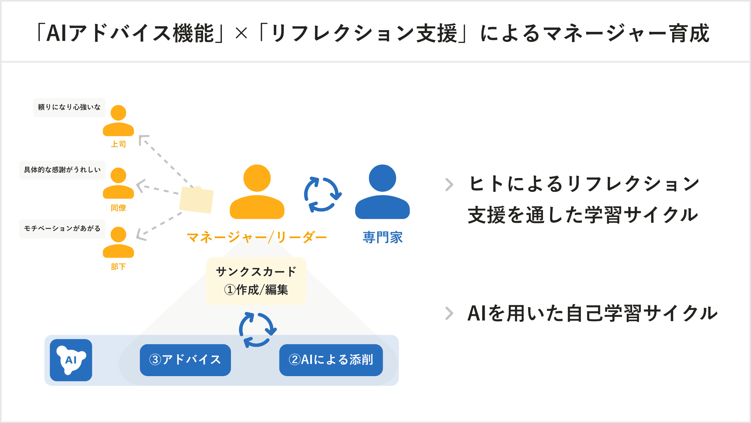 「AIアドバイス機能 × リフレクション支援によるマネージャー育成」の概念図