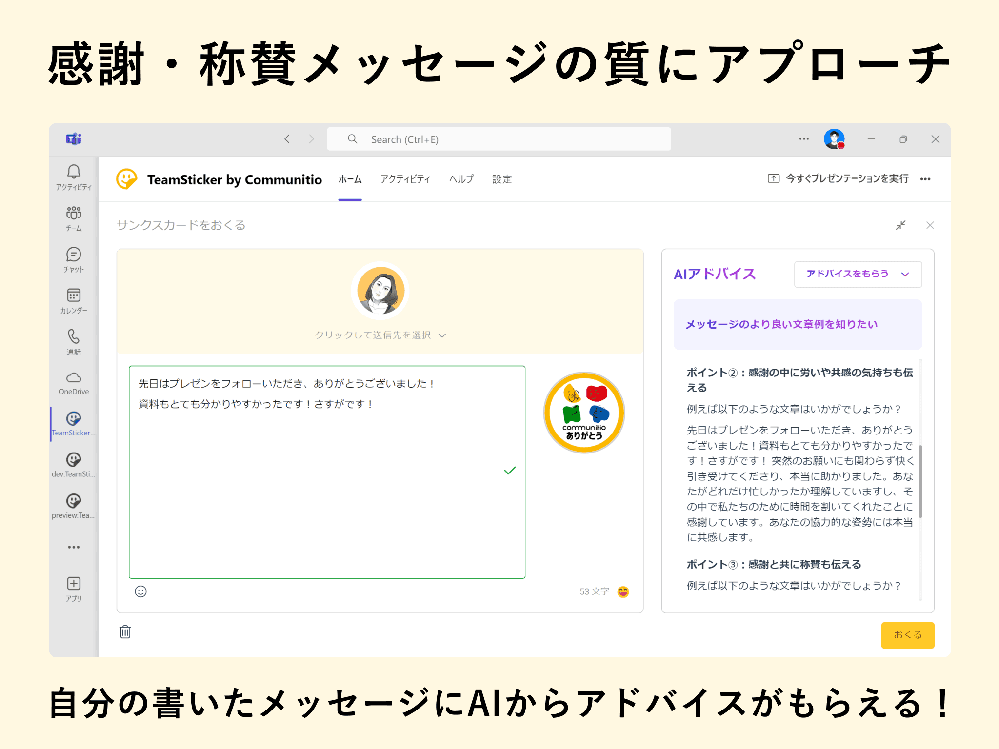 感謝の習慣はついてきても、「どうメッセージを送ればいいか分からない」という声も、まだまだありました。特に、メッセージの中身の質を意識する必要がある場面、例えばリーダーからメンバーへのフィードバックをするときなんかは、苦戦されている方がいました。少なくとも、送るまでに時間がかかっている方が多い状況でした。メッセージの質が高くなるための学習機会として「AIアドバイス機能」の活用をコミュニティオの皆さんから薦められて、試しに導入してみました。