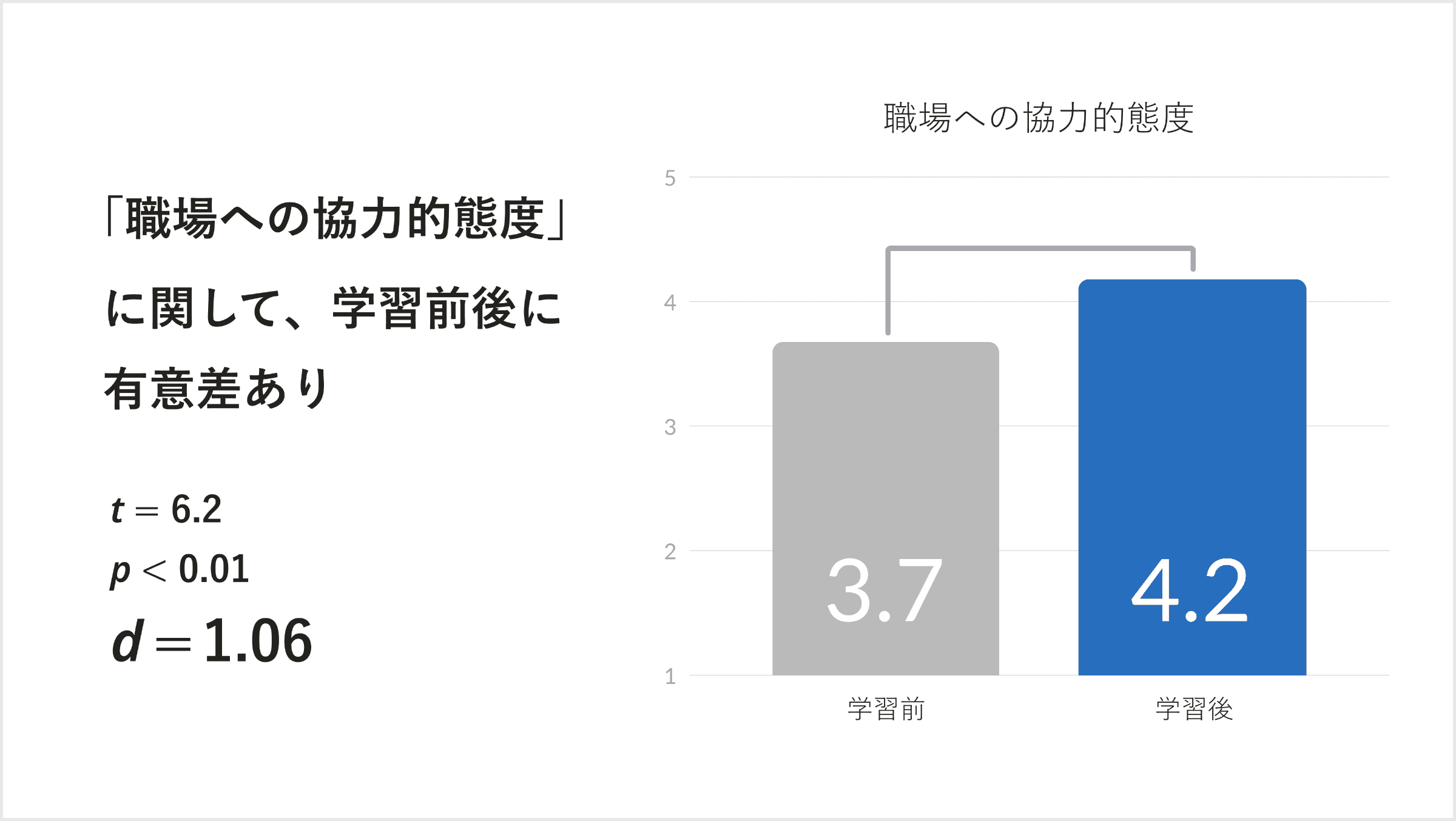 効果検証結果②:自己回答式の質問票を用いて「職場への協力的態度」に関する学習前後の比較結果