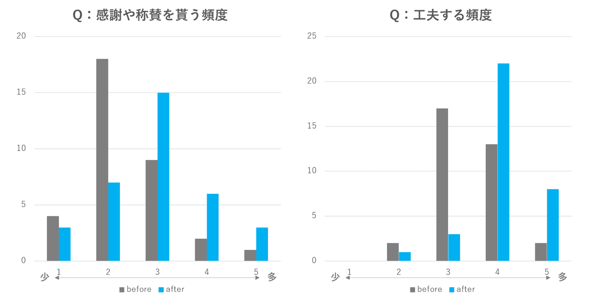 具体的には、導入から一か月後のアンケートで、感謝が伝わりやすくなった、課内の隠れた善行を見つけられた、といった項目が大きく増加しました。加えて、感謝や称賛をもらう頻度や、メンバーが業務の中で工夫する頻度についても、大きく改善しました。