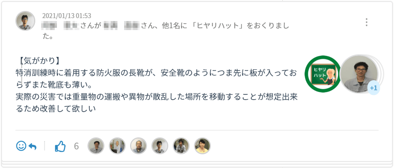 実際にヒヤッとしたとき、危険源が気になったときに手軽に投稿できることから、チームステッカー導入後2か月で前年度に提出されたヒヤリハットの半数以上の件数が投稿されました。ヒヤリハットがタイムラインで共有されると、日常的に危険箇所を認識することができ、更に、返信機能で部署全体で対策を考えられるのはチームステッカーを用いる利点でした。