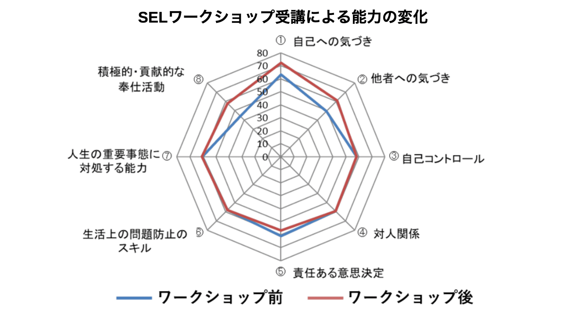 ある参加者の「社会性や情動に関する能力」の変化データ。SELワークショップ受講によって、「自己への気づき」、「他者への気づき」等の能力が向上していることを確認した