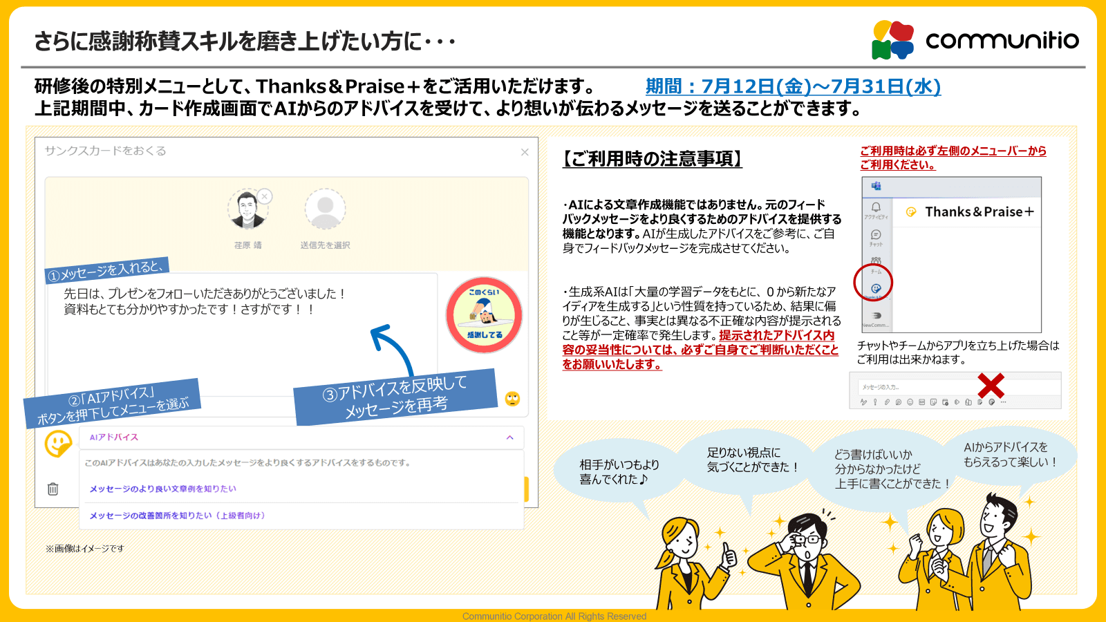 研修とそれを踏まえたAIのアドバイスによって、ひとりひとりの表現力が引き出されていると感じます。それに、素直に、もらったらうれしいですし、送る方もうれしいんですよね。エンゲージメント向上のためにも、取り組みを続けていきたいと思います。