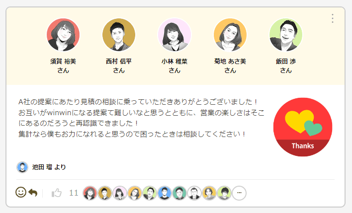 チームステッカーは、業務中のふとした感謝や称賛を感情の伝わるステッカーとメッセージで伝えられるツールです。