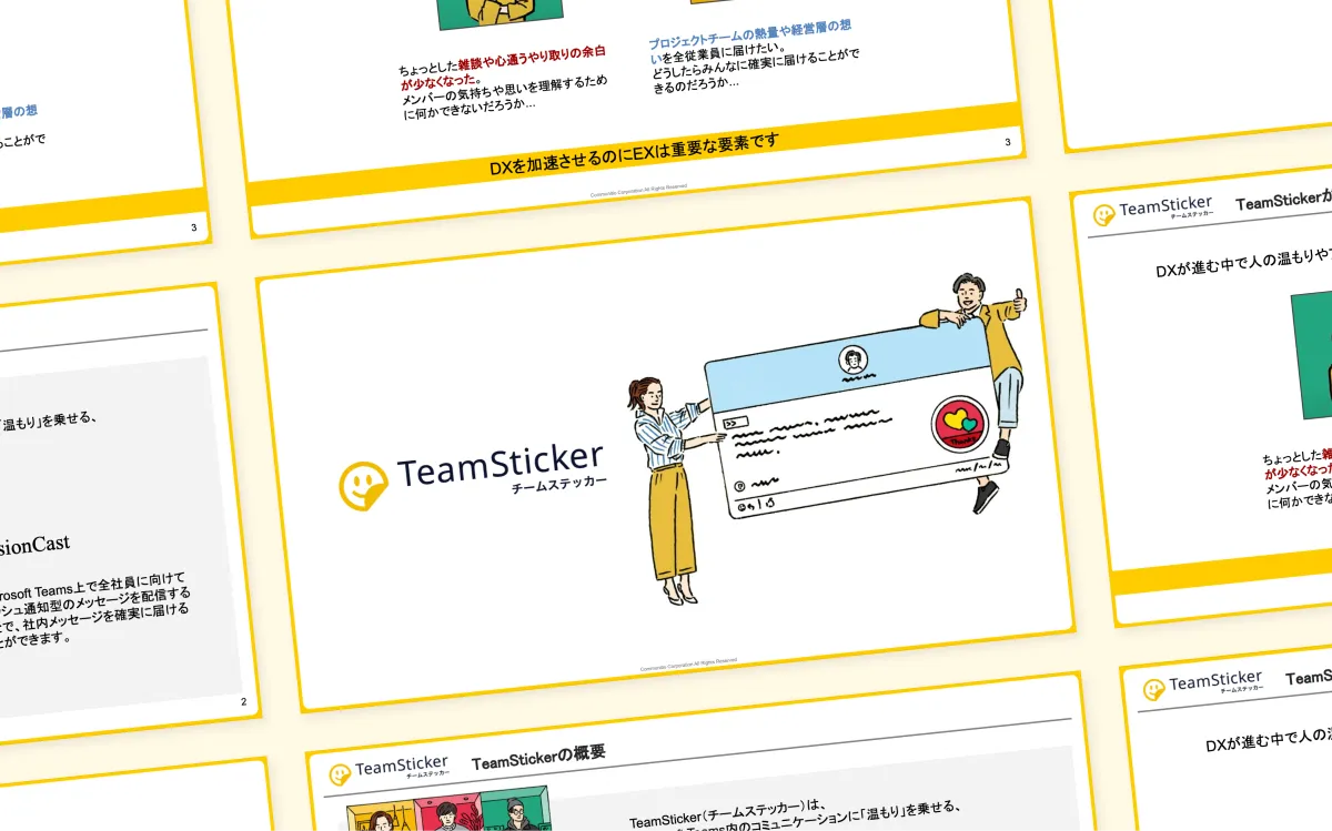 TeamSticker(チームステッカー)にご興味・ご関心をお持ちいただきありがとうございます。資料では、チームステッカーの機能、お客様の声・活用事例などをご紹介しております。